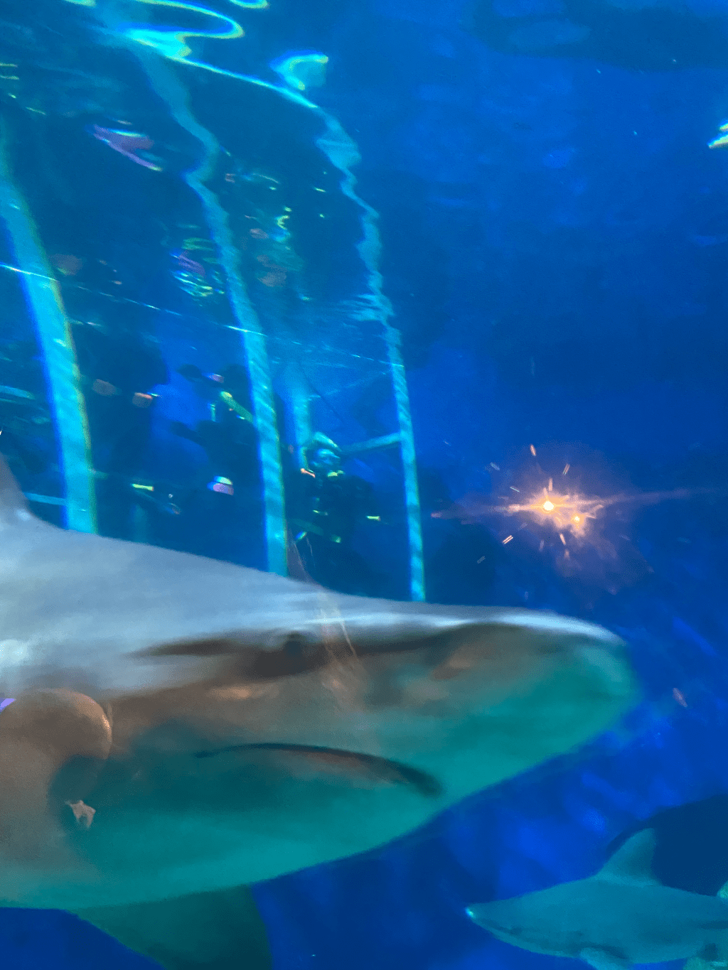 But something that surprised me a little was that my dad kind of felt scared, not because of the sharks, though. It was the regulator that freaked him out, my dad says that it was just a completely different way of breathing and not being able to use his nose didn’t help. But for me, I knew it was gonna be hard (or really I mean just different) to breath because I did a scuba diving experience in Monterey Bay Aquarium with my brother in California.